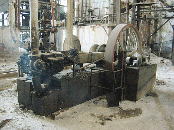 This disused Tangye engine at the closed mill at Colomadu drove the lime plant machinery. The steam chest cover carries the inscription 'Tangye-Johnson Patent, Automatic Cut Off Gear'. (RD) |