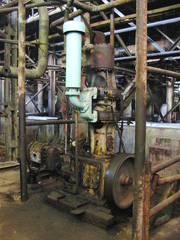 Virtually the only Fletcher engines to be seen in Java are their air compressors. This one is a remarkable survivor because it is at Sragi, a mill which was modernised in the 1970s and contains no other active steam powered equipment. It must be possible that this was brought in from a closed mill when a newer electrically powered compressor failed. (RD) |