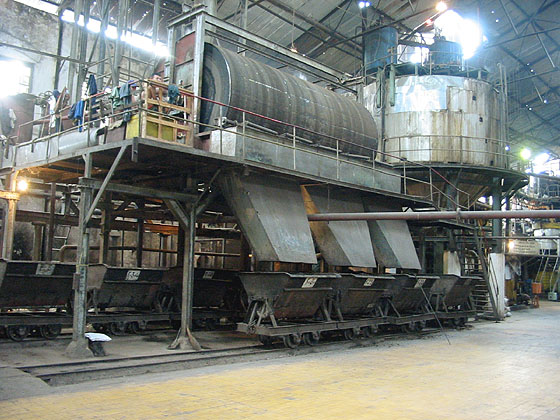 Traditionally the blotong was transferred to mud skips which were taken out of the mill and dumped for use as fertiliser (or low grade fuel where it contains significant amounts of bagasse). This is Kanigoro with the Dorr clarifier behind. (RD) |
