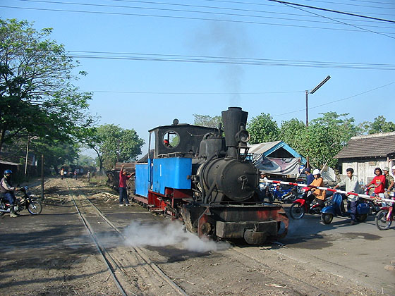 By 2003, there were few mud trains left, trucks having largely taken over. At Kanigoro, 1, built by Borsig shunts the mud skips, the last regularly steam hauled mud train in Java. (RD) |