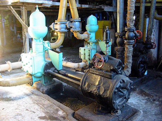 Wherever a liquid has to be moved in a Javan sugar mill, the most likely device will be a Cameron simplex pump. This pair are at Panji. (RD) |