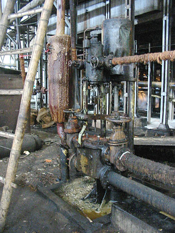 Vertical cylinder juice pumps are in the minority in Java. This juice pump at Watutulis has no identification and is very different from any other juice pump shown in this project, but is a Weir product as shown by comparison with their boiler feedwater pumps. (RD) |