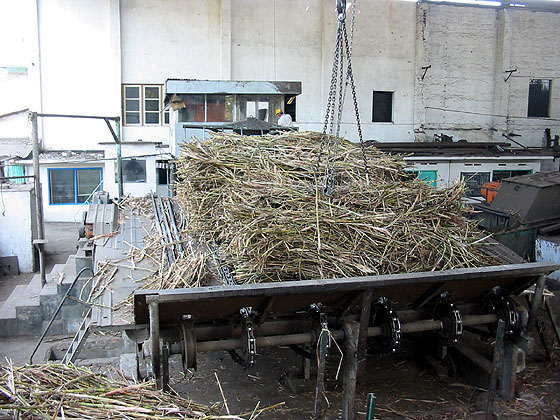 Krembung has a conventional unloading process for the cane table, the chains are looped around the cane before hoisting. (RD)
