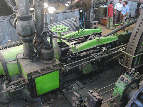 It operates on the same principle as the Stork engine seen at Pajarakan. It is the second mill engine in the reserve line at Rejoagung, used only at busy times or when the first turbine driven line has broken down. (RD) |