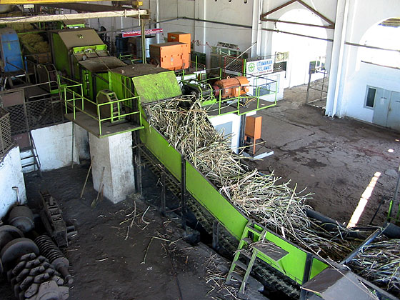 This scene at Gending is typical for a mill today. The cane travels up the conveyor where it passes through a unigrator/shredder prior to milling. (RD) |
