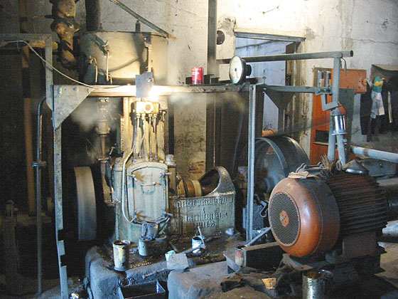 Factory chimneys improve the draught for the boilers, but sometimes this is insufficent. At Sudhono, this vertical cylinder Hallesche belt engine has been installed to drive an induced draught fan to improve it. (RD) |