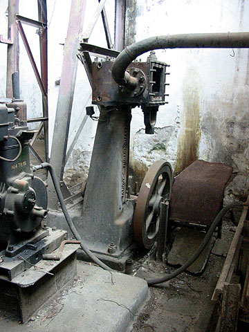 Included here because it does not fit naturally anywhere is this Tangye vertical engine at the closed mill at Colomadu. Even before closure it seems it had actually been replaced by the internal combustion engine on the left. (RD) |