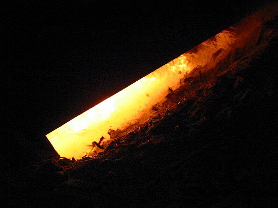Properly prepared bagasse has excellent combustion properties as clearly demonstrated by this view through the furnace feed. (RD)