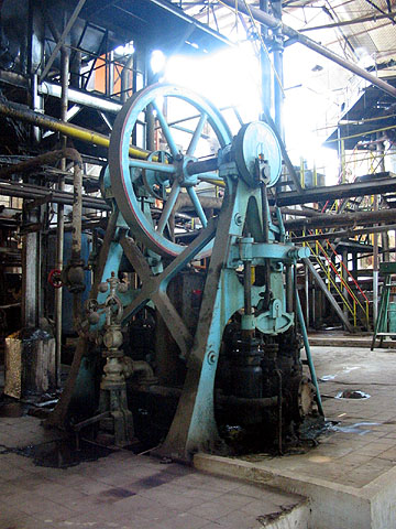 The magnificent pump is unidentified, bearing only a ubiquitous 'Rombouts' plate. It is certainly much older than the filter it serves! (RD) |