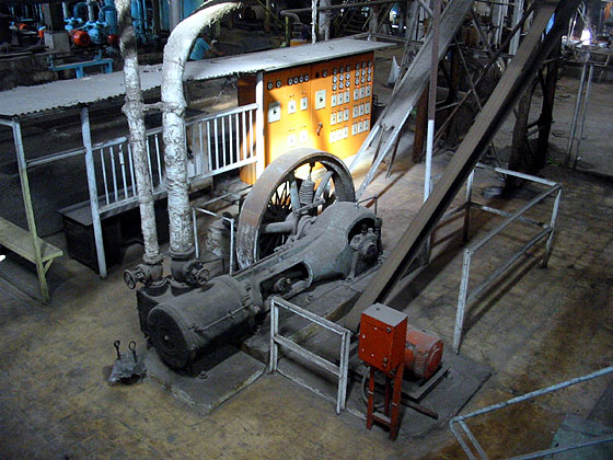 These two pictures actually show the engine for the belts for the pumps associated with the low grade centrifugal system (the actual centrifugals are electrically powered). The other similar engine is less well positioned for photography. (RD) |