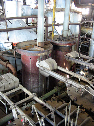 Squeezed in between the juice heaters and one of the evaporators are the syrup sulphitators. (RD)